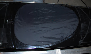 Along with accomplishing many other things weekend I made my first two cockpit covers for the Tahe on Saturday. I was unable to find any thin neoprene so instead I used lightweight rip stop nylon, $5 a yard and I can get three covers from a yard. The first (let’s call it a prototype) worked but was not the best. I made them by first cutting out a newspaper template of the outer cockpit rim, I then drew around the template onto the nylon with chalk, I then added two and a half inches outside that and drew a second line which I used as my cutting line. My first attempt I simply folded the edge over to the chalk line and attempted to sew around the edge about half inch in from the fold. It was very difficult to keep the fabric aligned with the inner line; I was not able to neatly pleat it, the slippery fabric finish made it particularly tricky. Once I had circled the cover once I added a second row of stitches this time much easier as the fabric was held in place. I fitted this one with a length of string fed around the edge to see what the fit was like and was pleased with the effect (but not the seams/sewing).