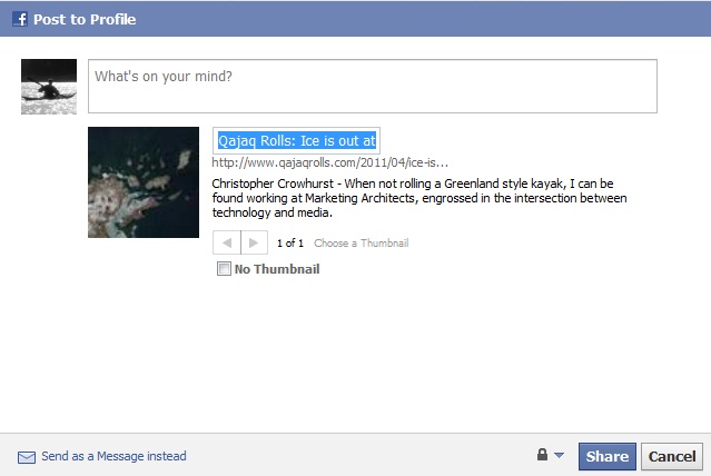 For the last year I have been rather annoyed by the way my blog posts show up in facebook when I post them as links, now instead I am rather annoyed at myself for my own ignorance. In case you like me would prefer to override facebook’s link preview text here are a sequence of screen shots showing how you can click on the preview title and text and replace it with whatever your hearts desire. No longer will my facebook links contain just the intro paragraph from my blog – hooray.