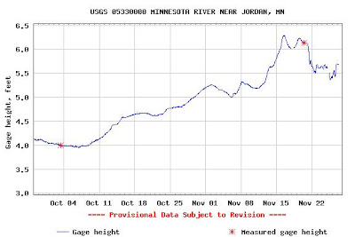 Earlier this year J and I kayaked the stretch of the Minnesota River around Jordan, my new found friends at the ISK describe this seciton of the river as a fast flowing sewer. I can say that the water was a ghastly brown color and there was little to appeal to the eye about the section up river from the town, it appears that down river the landscape becomes more appealing as the river enters the flats arround savage and winds its way down to the Port. There is a 17 mile trip from Shakope to Near the Missippi that I plan on doing next year after the thaw. Whilst researching the trip I came across a great site run by the USGS that has realtime data of the river flow, located here.