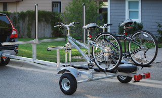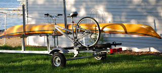 I assembled the “funky” light for the living room at the cabin, it looks great and the light seems ample to read by. My second task for the day was to see how the sports utility trailer would work with both bikes and kayaks on board. I had previously set it up in a way that I thought they might all fit (2 bikes 2 kayaks). I was wrong in several ways; first the horizontal supports for the kayaks were in the wrong place, they are both too far forward. Second the bikes are too close to the center on the trailer and there is insufficient room between them to fit the kayaks (even on edge) so back to the drawing board.