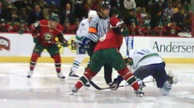 Yesterday J and I were fortunate enough to be given tickets to the best seats in the house, front row “on the glass” next to the penalty box at the Xcel Energy Center, we saw the Wild play the Vancouver Canucks. We also got to hang out in the “Fishing Lodge” which is a bar in the depths of the building, the cool part about the Fishing Lodge is that it is on the route that the players walk to get to their changing rooms so we got to see them up close and personal.